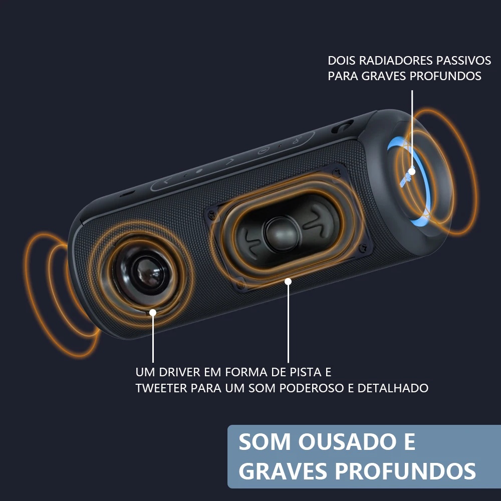 Dois radiadores passivos para graves profundos, um condutor em forma de pista e tweeter