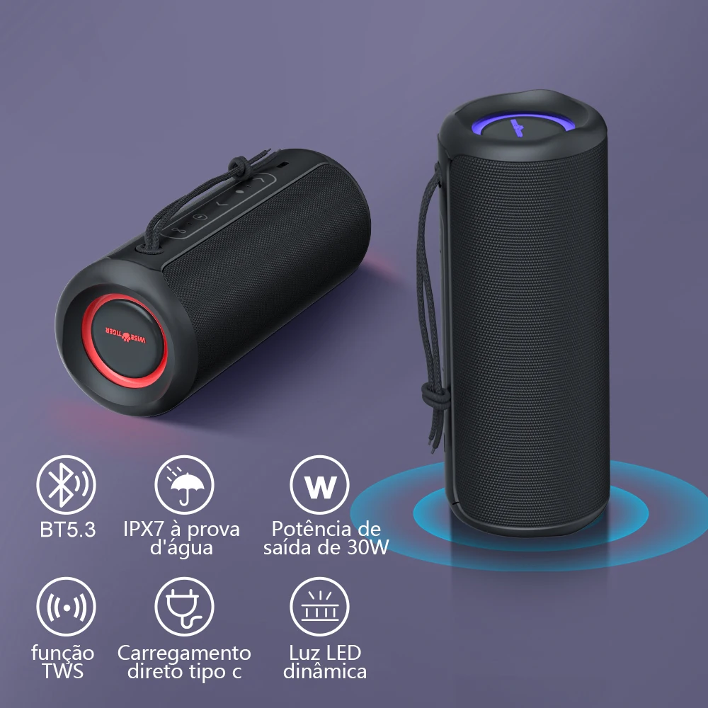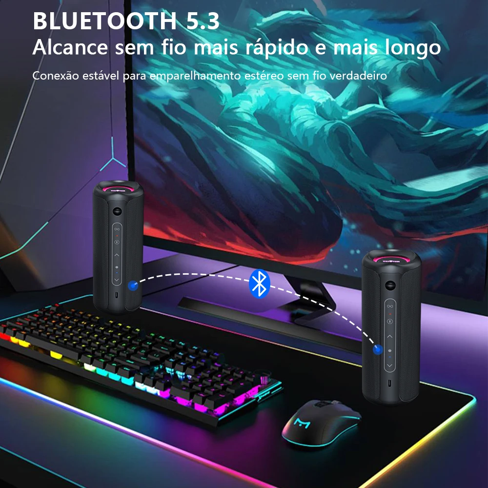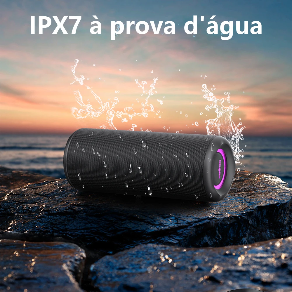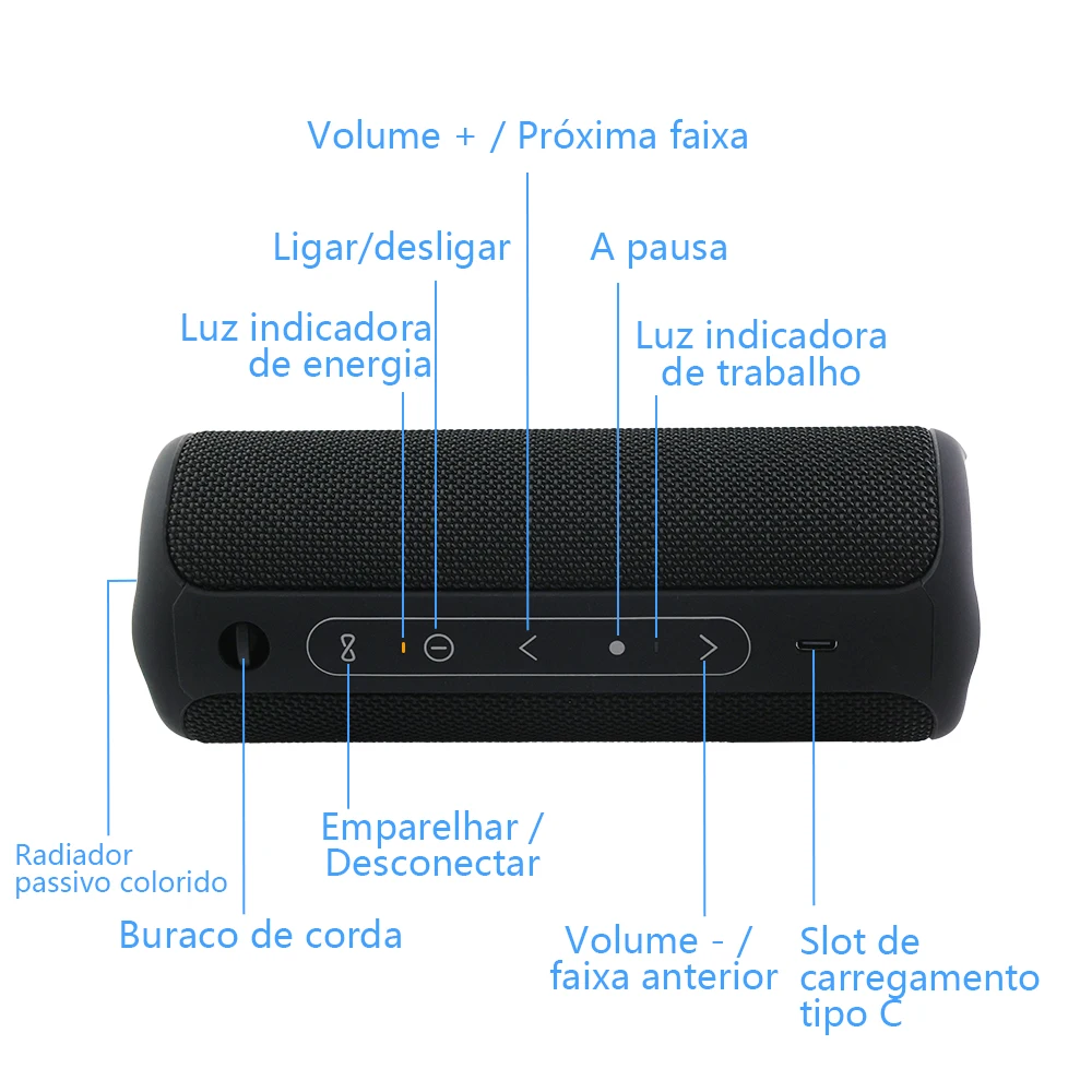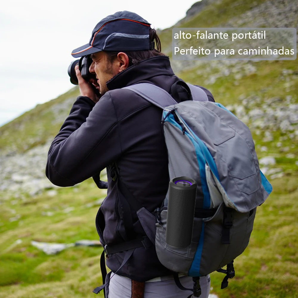 Bateria recarregável: Alto-falante portátil carrega através do cabo USB-C (incluído). A bateria de íons de lítio oferece até 20 horas de vida por carga.