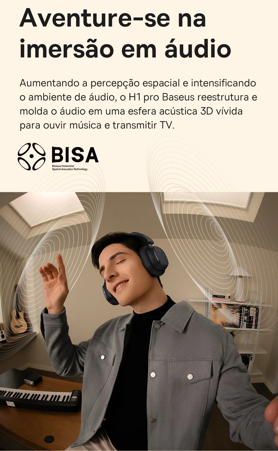 Aumentando a percepção espacial e intensificando o ambiente de áudio, o Baseus H1 pro reestrutura e molda o áudio em uma esfera acústica 3D vívida para ouvir música e transmitir TV