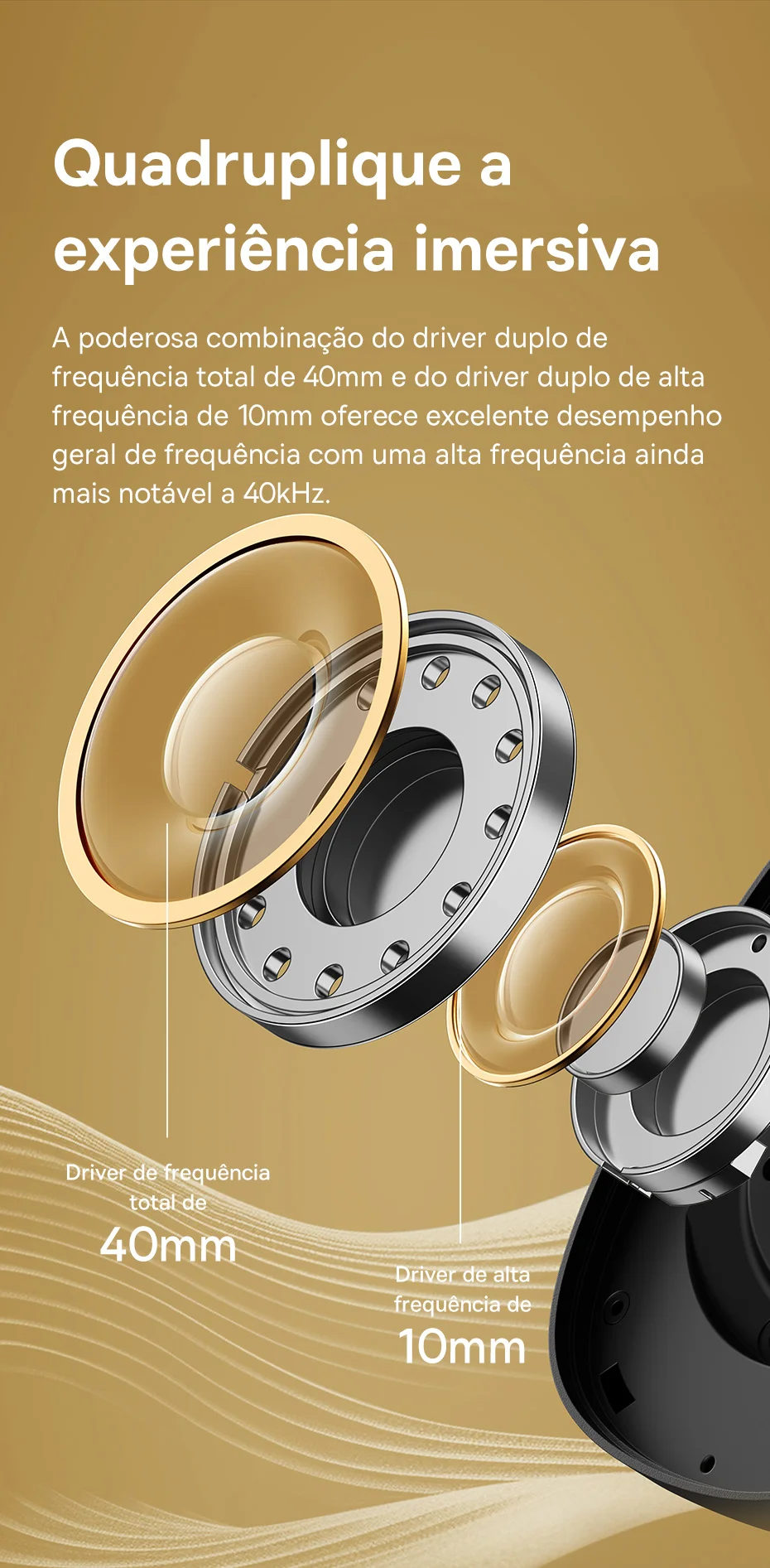 O poderoso dual 40mm full frequency driver e dual 10mm alta frequência driver combinação oferecem-lhe excelente desempenho de frequência global com uma alta frequência ainda mais notável em 40kHz