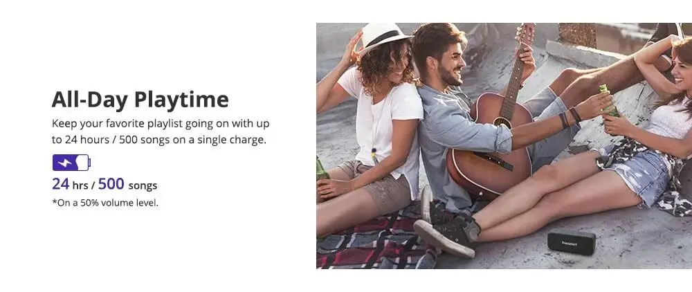 Mantenha sua lista de reprodução favorita em andamento com até 24 horas/500 músicas em uma única carga.