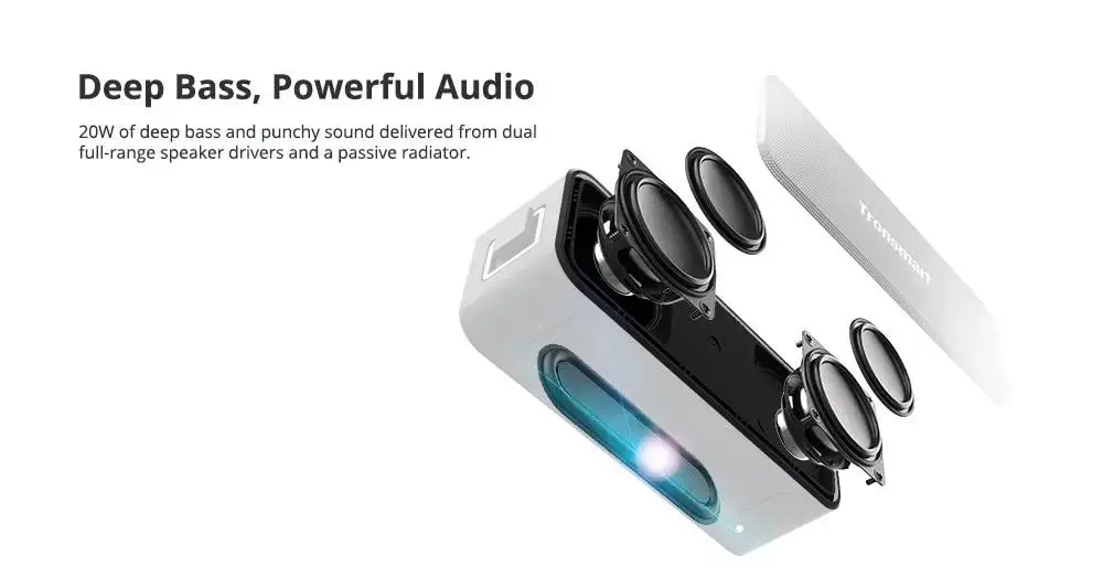 20W de graves profundos e som incisivo fornecidos por altifalantes duplos de gama completa e um radiador passivo.