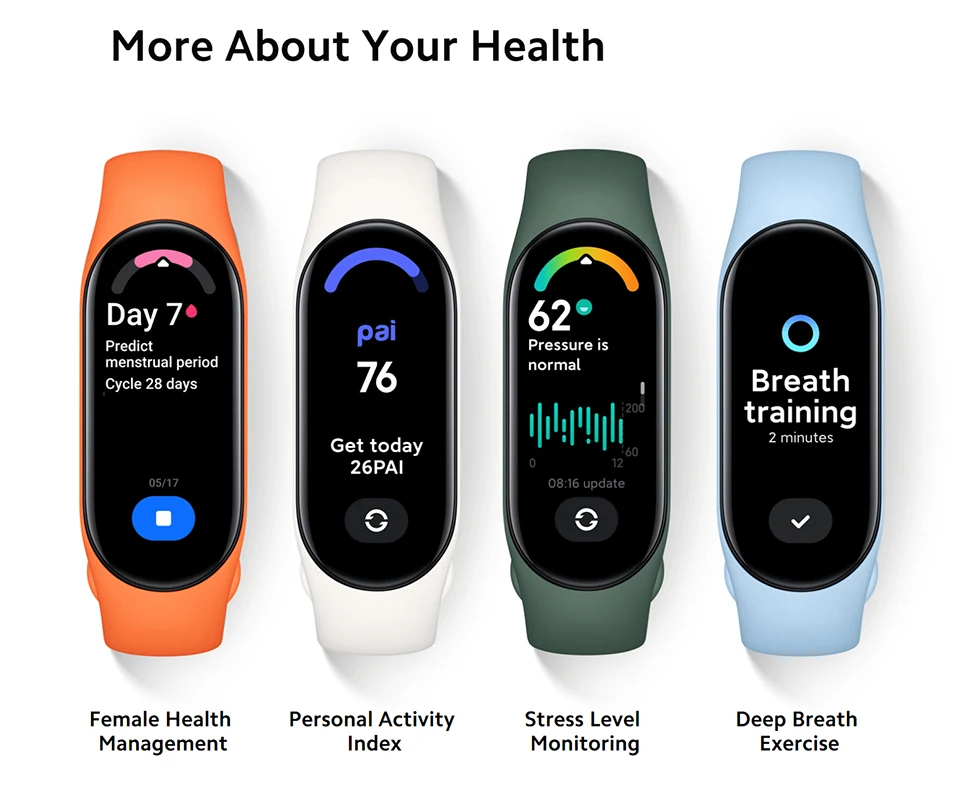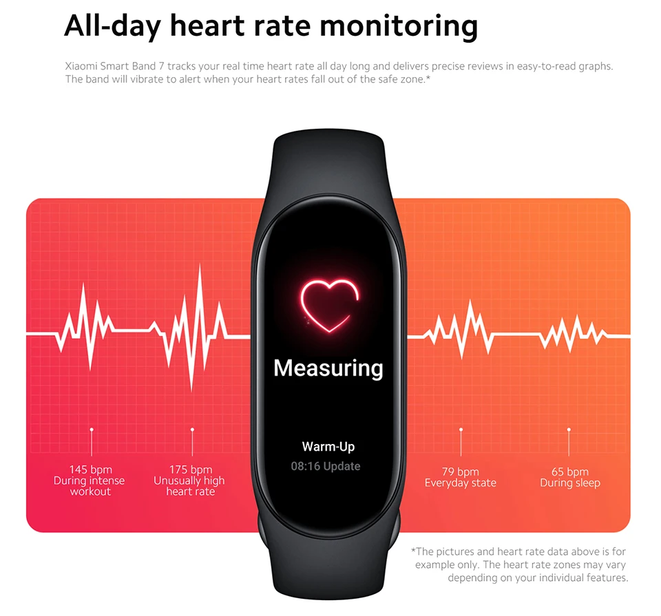 O Xiaomi Smart Band 7 rastreia sua frequência cardíaca em tempo real durante todo o dia e oferece avaliações precisas em gráficos fáceis de ler. A banda vai vibrar para alertar quando seus batimentos cardíacos caírem para fora da zona segura. *
