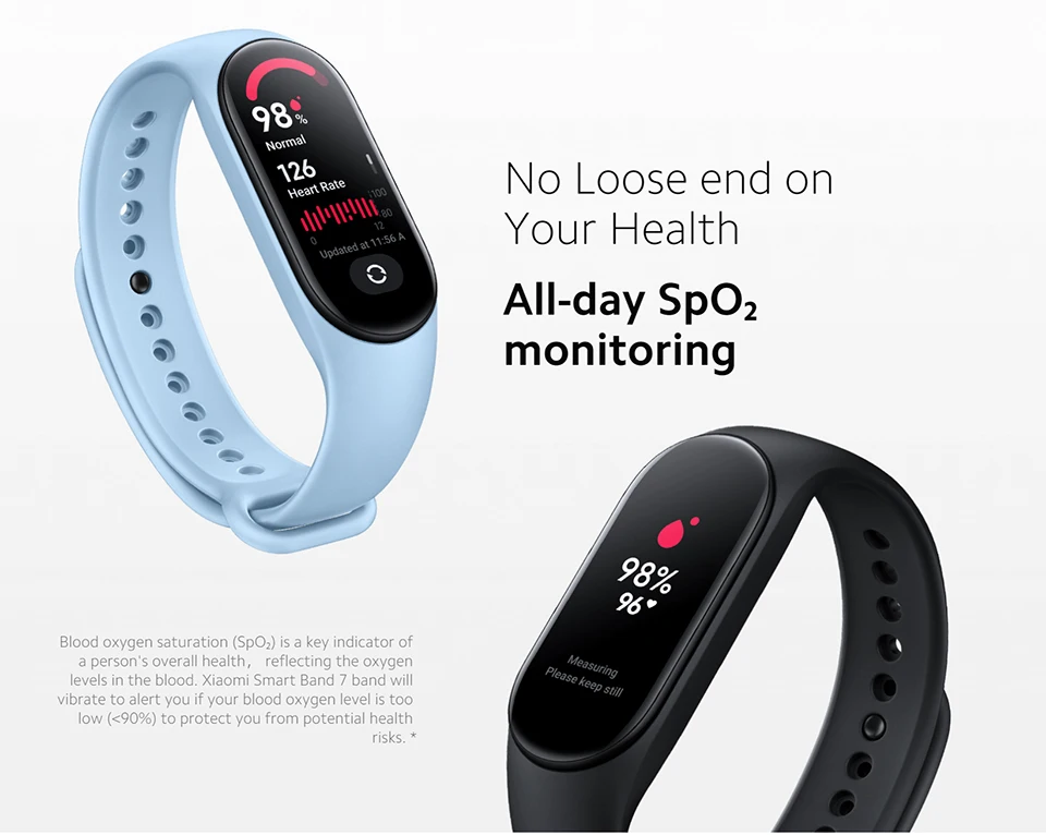 A saturação de oxigênio no sangue (SpO₂) é um indicador-chave da saúde geral de uma pessoa, refletindo os níveis de oxigênio no sangue. A banda Xiaomi Smart Band 7 vibrará para alertá-lo se o seu nível de oxigênio no sangue estiver muito baixo (<90%) para protegê-lo de possíveis riscos à saúde. *
